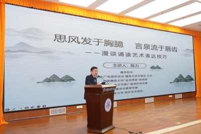 之后,市级诵读培训专家、重庆广播电视集团(总台)新闻主播、播音指导陈力为在场师生开展《思风发于胸臆 言泉流于唇齿——漫谈诵读艺术表达技巧 》专题讲座。陈老师围绕“诵读的含义与感受”“诵读的有声语言表达技巧”“舞台表现”三个主题,列举丰富生动的诵读素材和实践案例,设置环环相扣的互动环节,讲解诵读应有的状态感受、归音技巧和态势语言。他幽默风趣的语言艺术、深入浅出的讲解技巧、生动活泼的教学互动,让与会师生受益匪浅,现场掌声连连,气氛活跃自然而又热烈欢快。