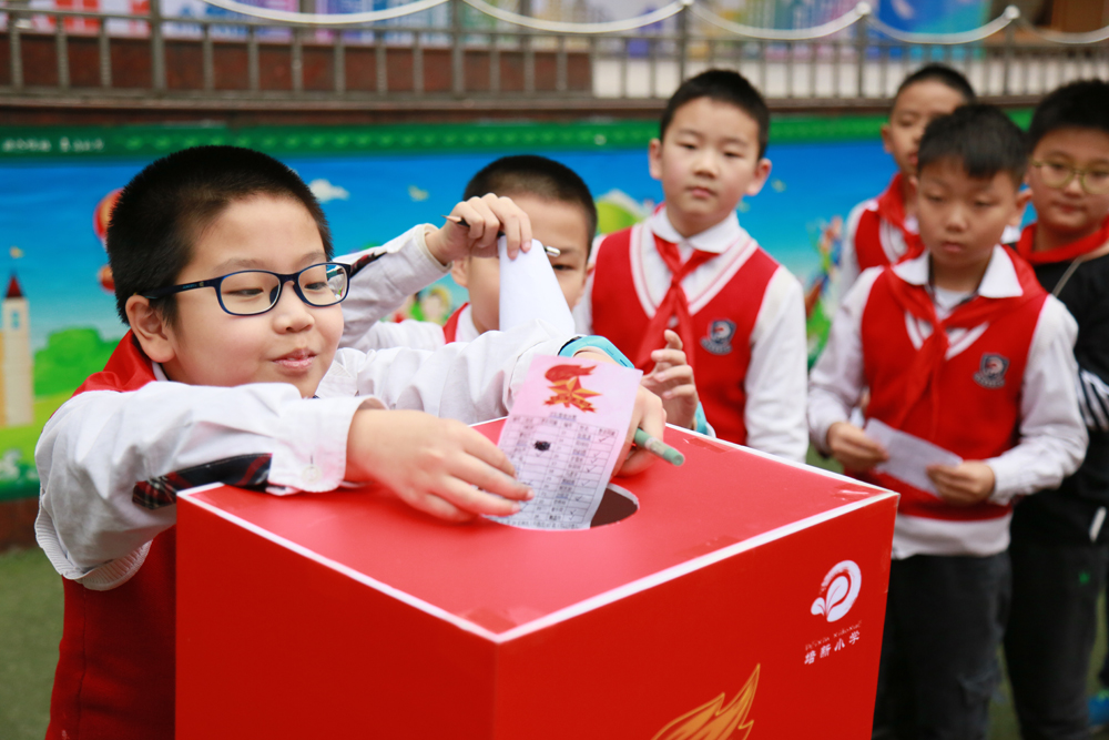 江北区培新小学开展“向改革开放40年献礼”建队日主题集会活动,少先队员们为新一届大队委员投票