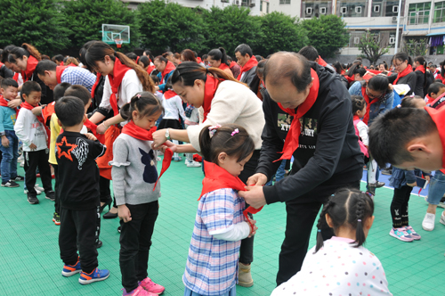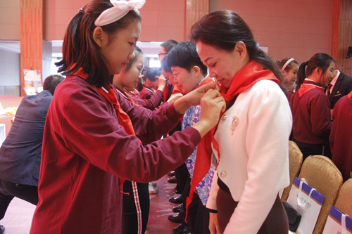 丰都县举行庆祝中国少年先锋队建队69周年及标准化少先队主题队日活动中,家长为新队员系红领巾