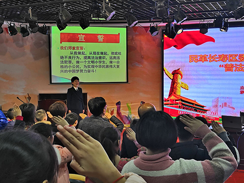 长寿区桃源小学开展法制教育进校园活动,同学们在检察官带领下宣誓